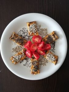 Roggenvollkornbrot mit Tomaten- Basilikumaufstrich, Chiasamen & Sonnenblumenkernen: